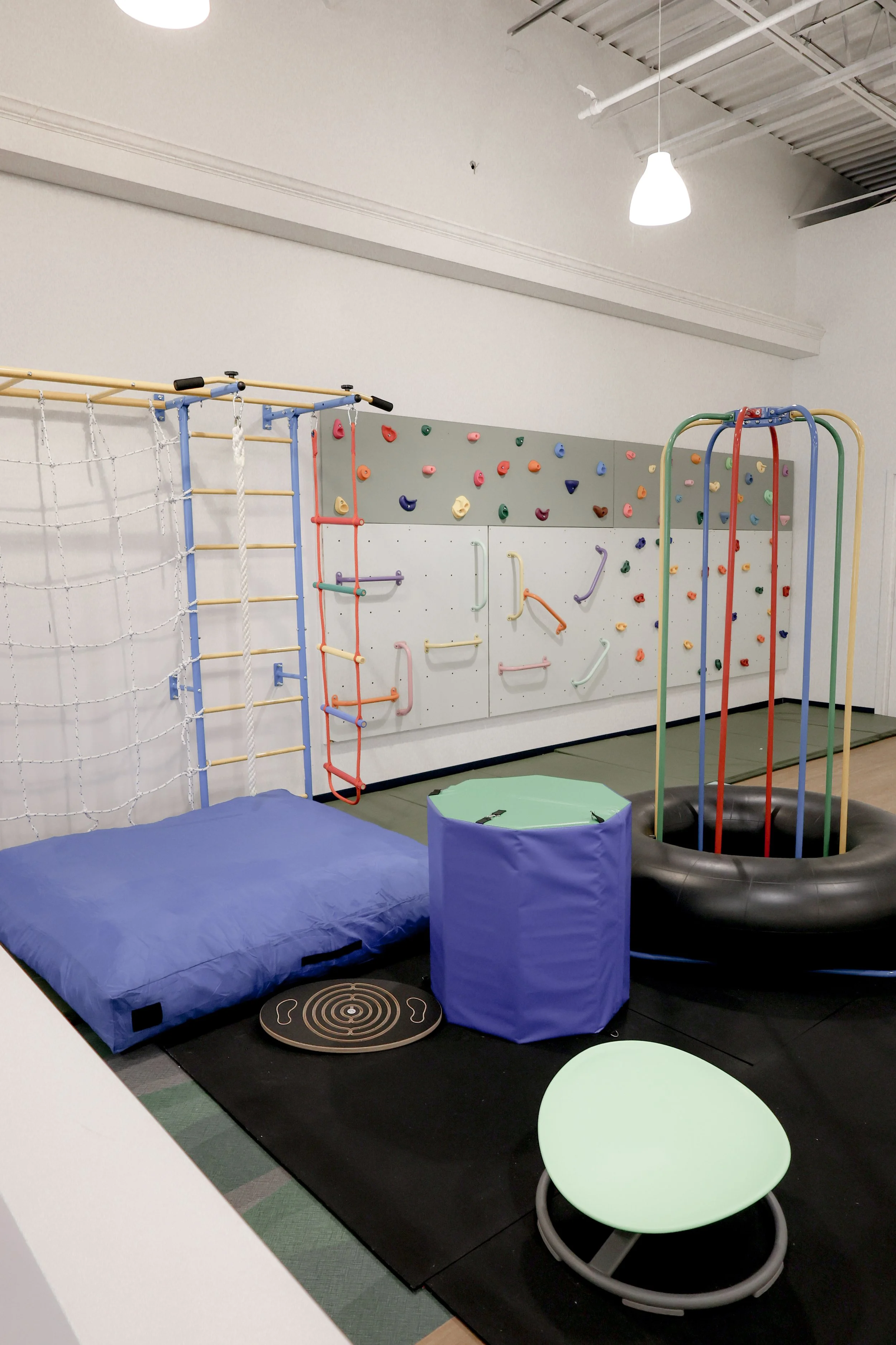 Focused on guests 5-10. Our ‘gym’ area will feature balance equipment, climbing wall, crash pad and more! A space to safely jump, crash and play.